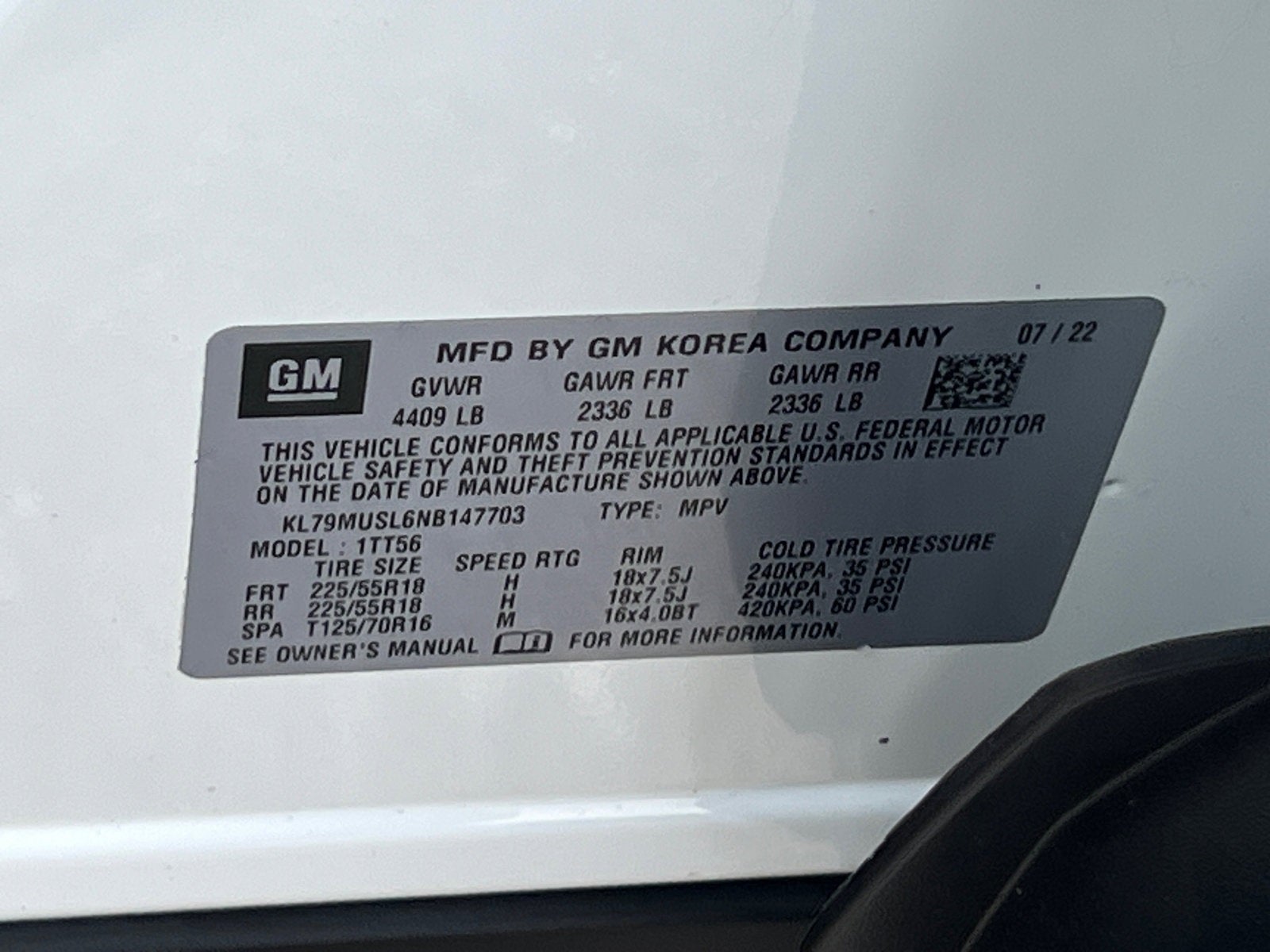 To check for open recalls please visit https://www.nhtsa.gov/recalls?vin=KL79MUSL6NB147703#vin.