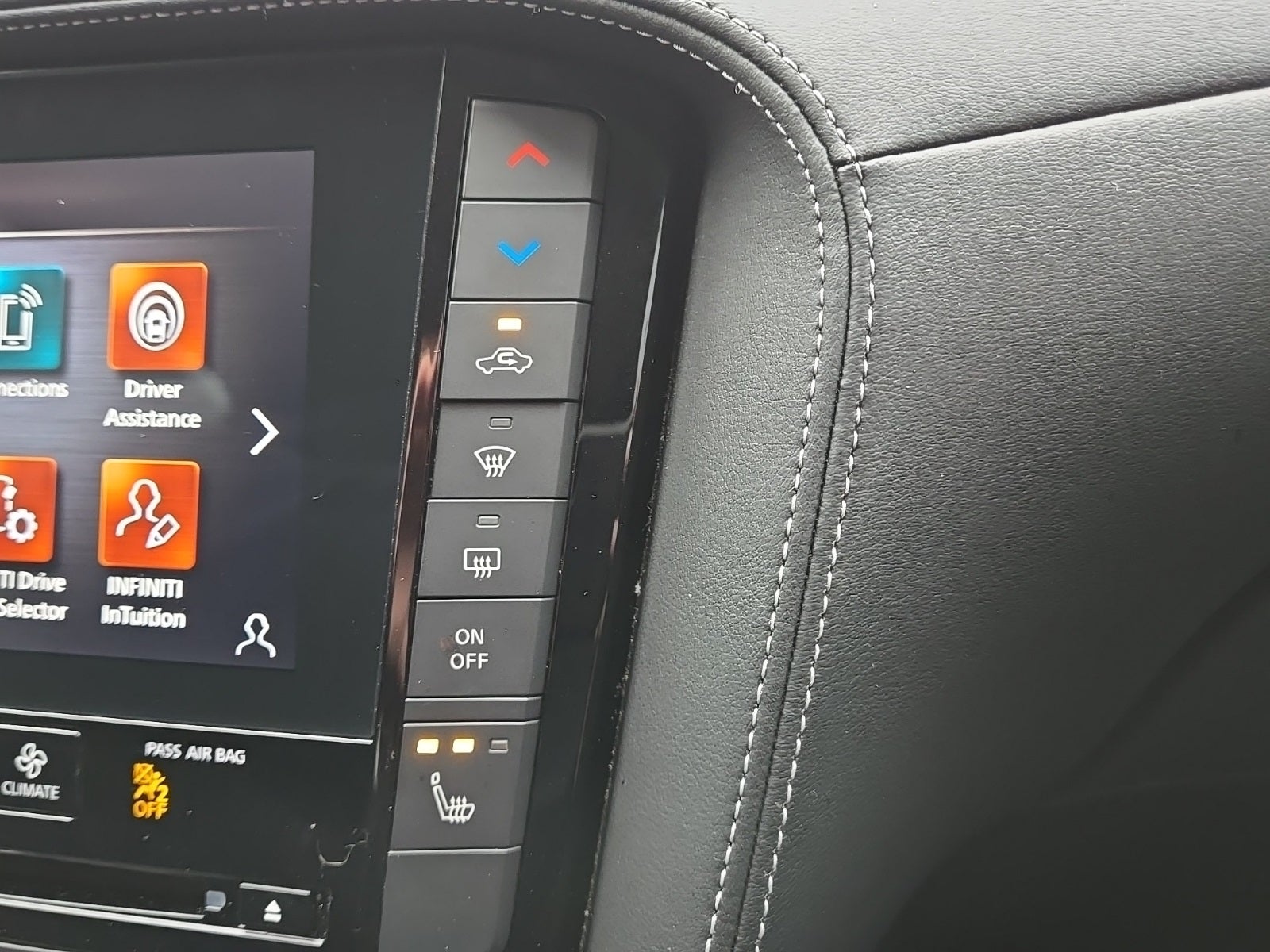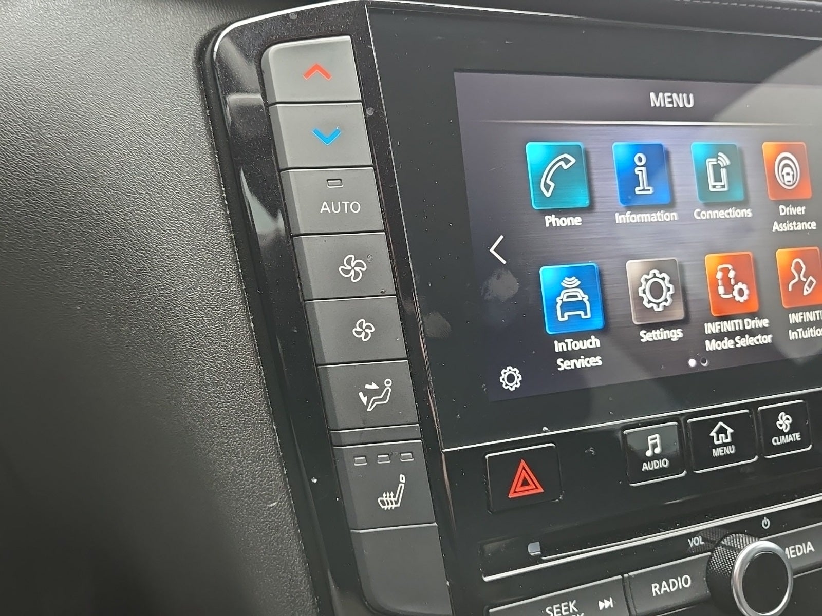 - Radio: HD Audio System -inc: INFINITI InTouch, INFINITI InTouch services, INFINITI InTouch dual display system w/upper 8" and lower 7" HD touch screens, wireless Apple CarPlay, Android Auto, HD radio technology, SiriusXM radio w/advanced audio features and 90-day complimentary trial, INFINITI voice recognition, Siri Eyes Free, Wi-Fi hotspot and active noise cancellation